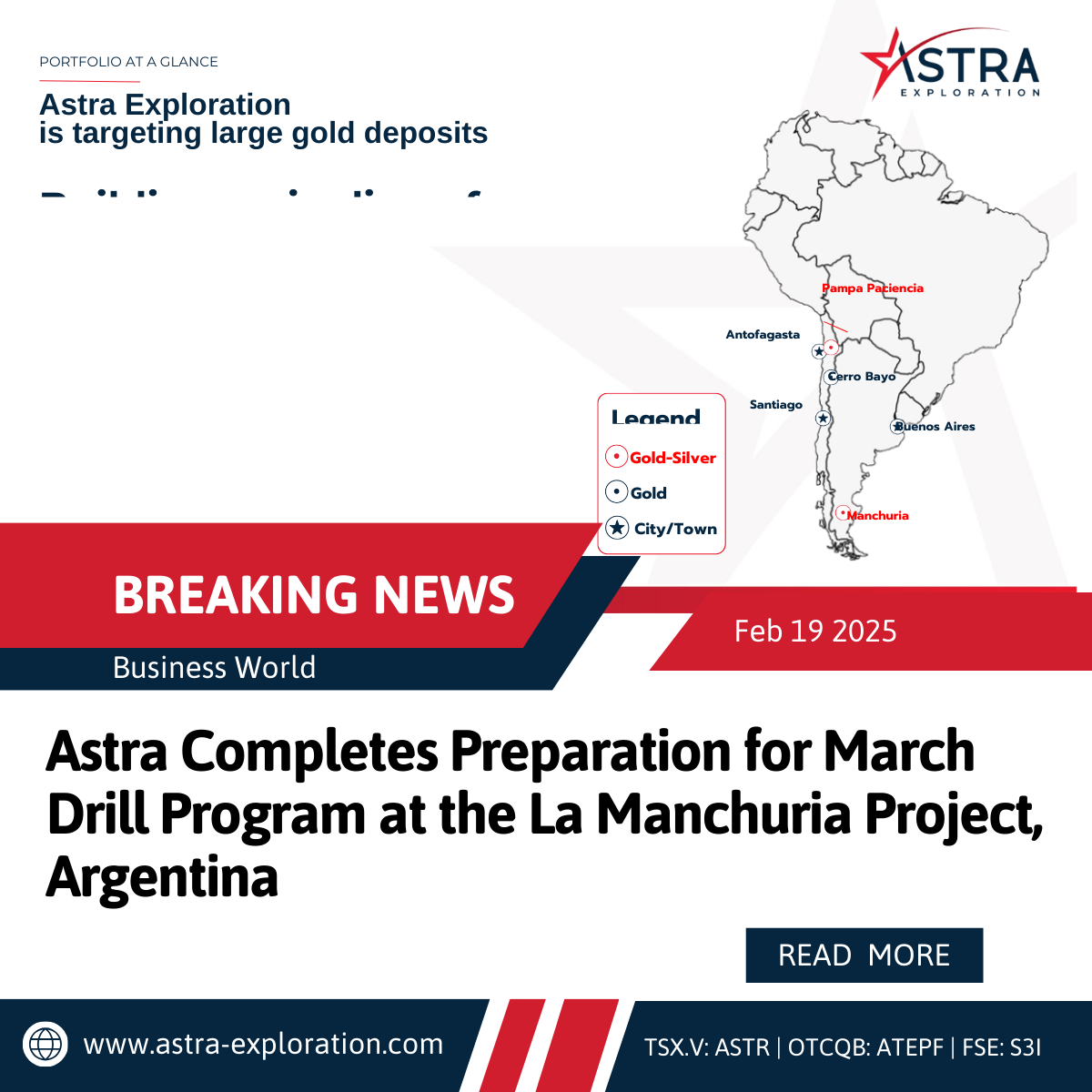 Vancouver, British Columbia – February 19, 2025 – Astra Exploration Inc. (TSX-V: ASTR, OTCQB: ATEPF, FSE: S3I) (“Astra” or the “Company”) is pleased to provide an update on exploration activities at the La Manchuria Gold and Silver Project in Santa Cruz, Argentina.