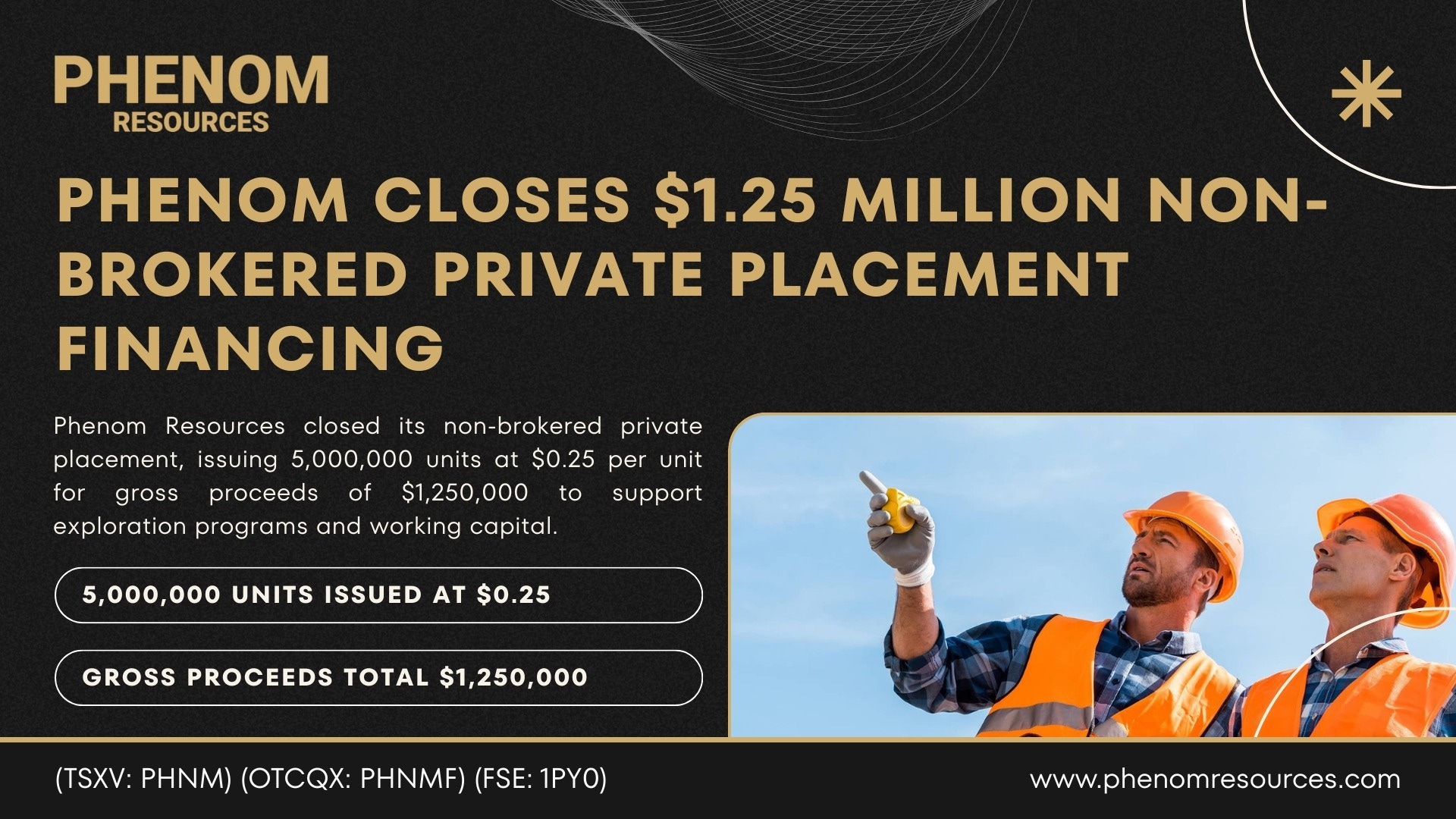 Phenom Resources Corp. is pleased to announce that it has closed its previously announced non brokered private placement financing (the “Offering“) and issued an aggregate of 5,000,000 units (the “Units“) at a price of $0.25 per Unit, for total gross proceeds of $1,250,000.